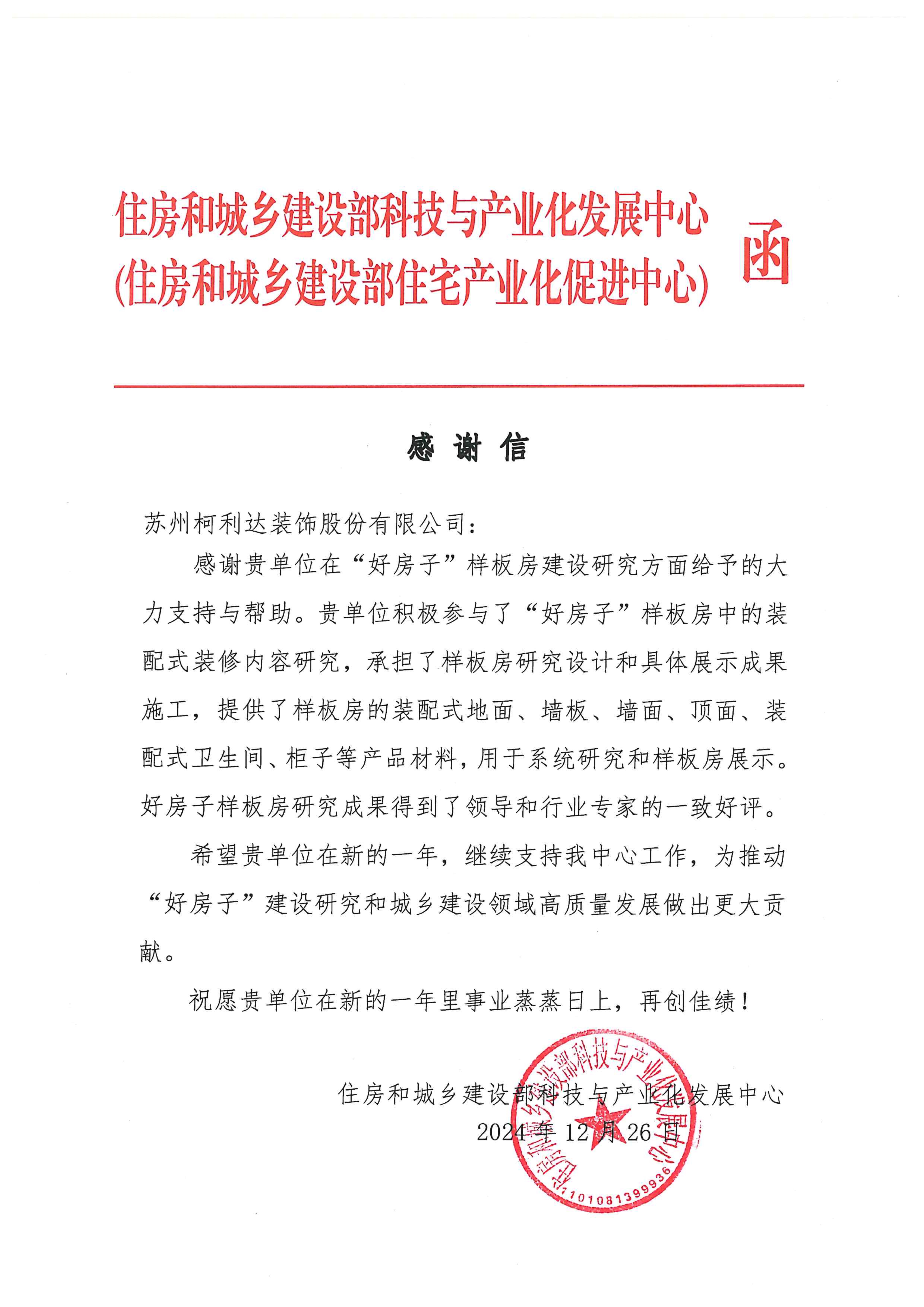 新歲漸近,祥光煥彩。在辭舊迎新之際,柯利達收到來自住房和城鄉建設部科技與產業化發展中心發來的感謝信,對公司在“好房子”樣板房建設研究方面給予的大力支持與